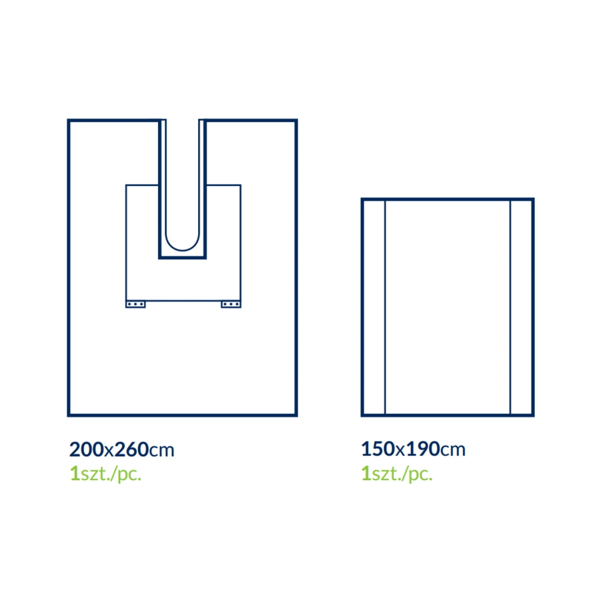 - 1 serweta wzmocniona, przylepna, z organizatorami przewodów w rozmiarze 200 cm x 260 cm z wycięciem "U o wymiarach 8,5 cm x 85 cm. Serweta wykonana z hydrofobowej 3-warstwowej włókniny (SMS) i wysoce chłonnej włókniny i wzmocnionej.