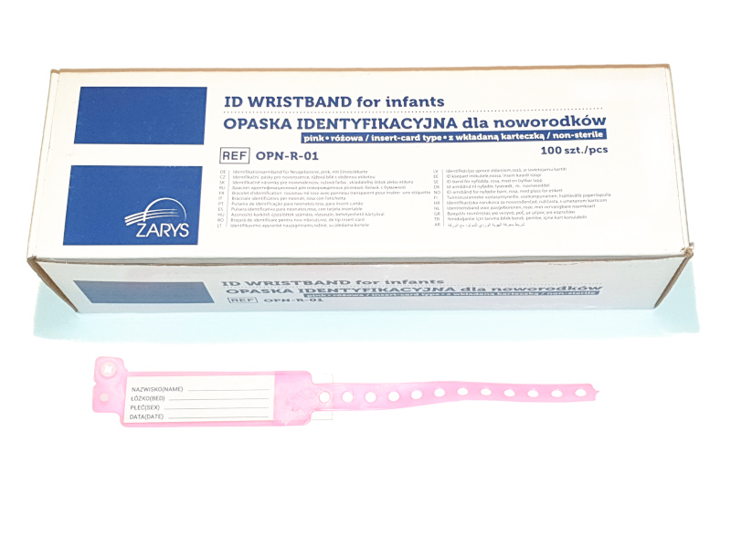 Opaska identyfikacyjna dla noworodków wykonane została z delikatnego tworzywa nie powodującego uczuleń ani odparzeń. Zapinana na zatrzask. Posiada 4 pola do wypełnienia (nazwisko, łóżko, płeć, data)