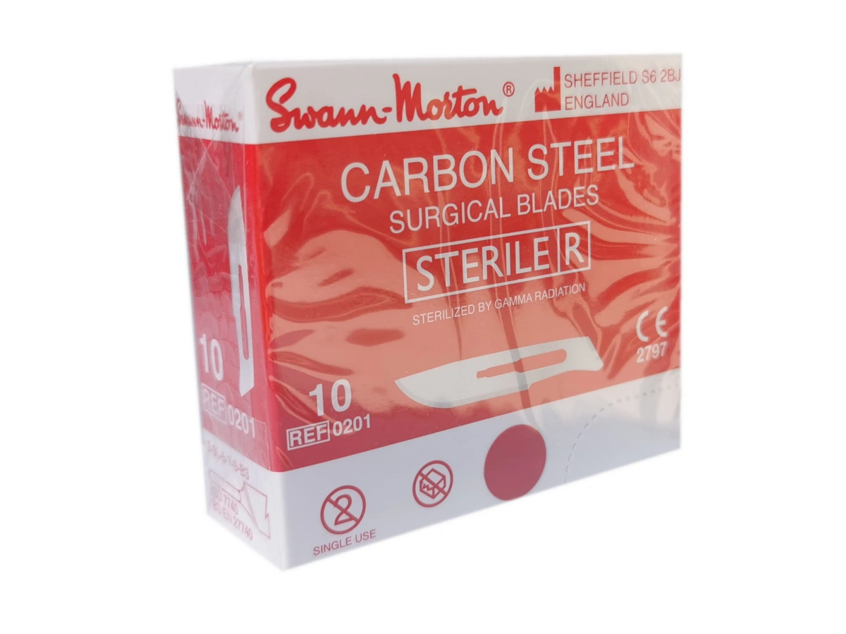 Sterylne, standardowe ostrza chirurgiczne Swann-Morton ze stali węglowej jednorazowego użytku.