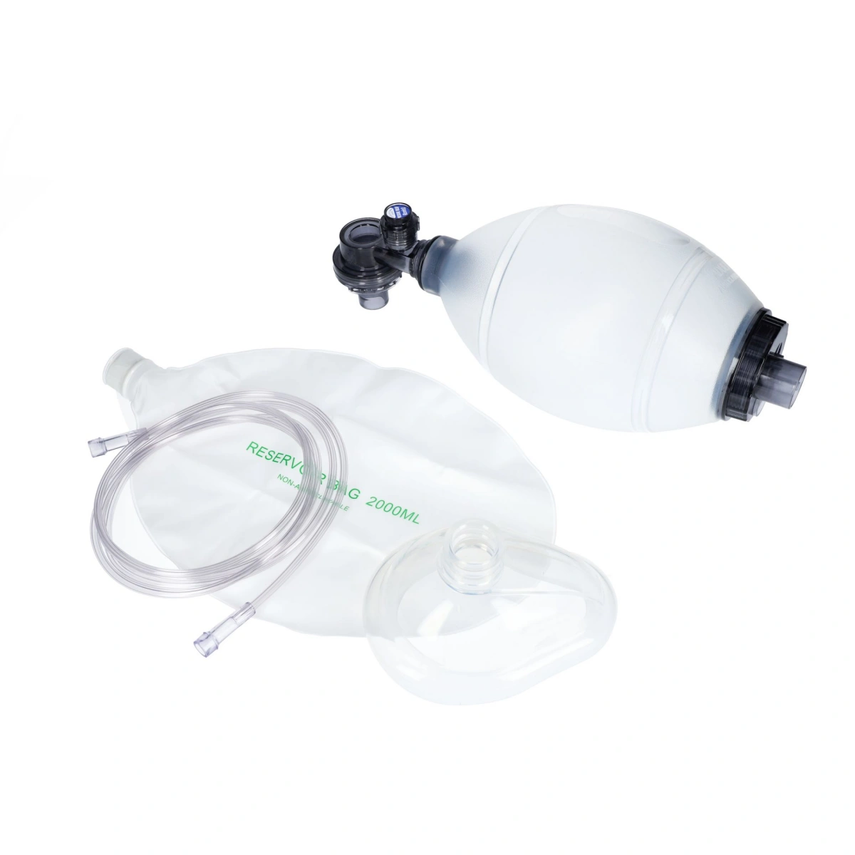 Zestaw niemowlęcy: maska silikonowa #0/#1/#2, zastawka pacjenta z zastawką wyrównawczą, worek silikonowy 240 ml, zastawka w rezerwuarze, rezerwuar tlenowy 1600 ml.
