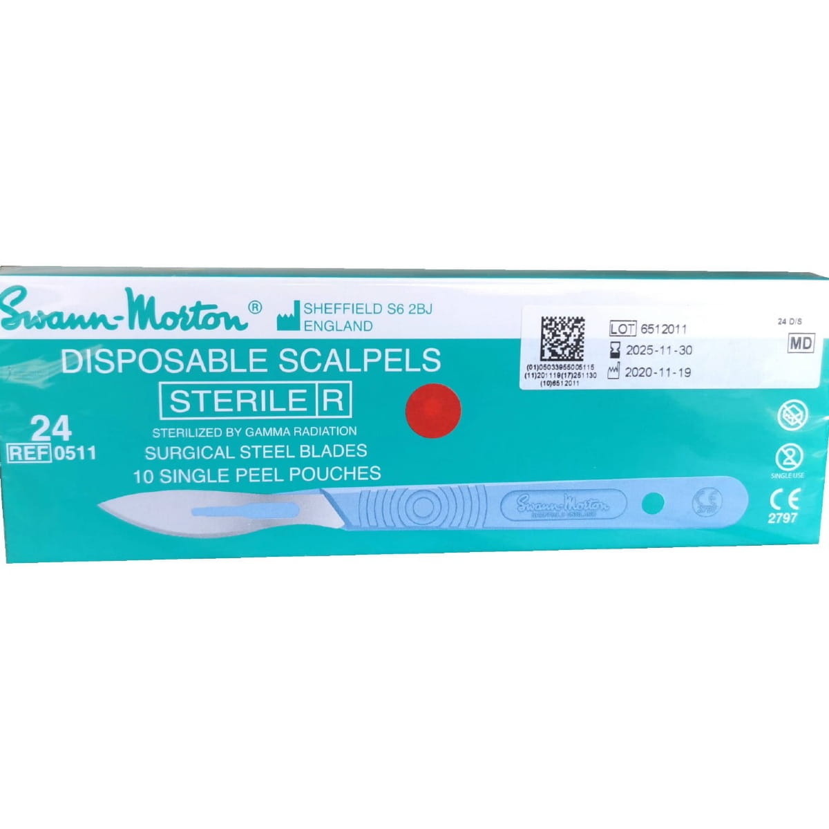 Jednorazowe skalpele sterylne angielskiej firmy SWANN MORTON w pakowane indywidualnie w opakowaniach.