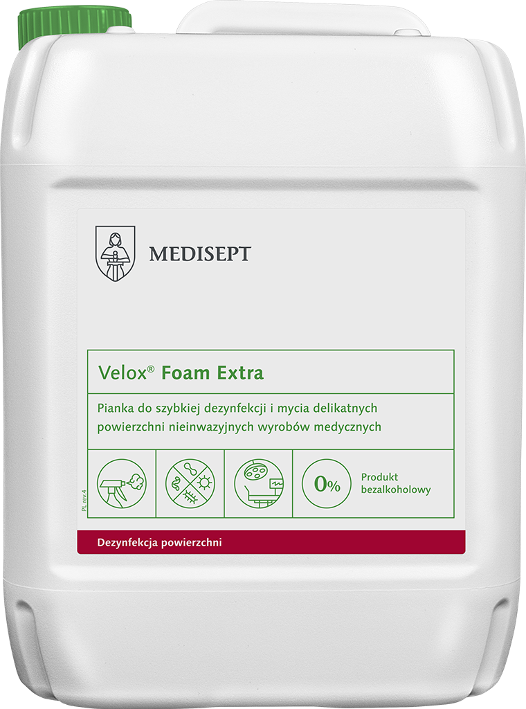 Velox® Foam Extra to pianka zalecana do dezynfekcji różnorodnych powierzchni w obszarze medycznym, domach opieki, salonach fitness i SPA, gabinetach kosmetycznych i masażu. Może być stosowana na oddziale intensywnej opieki medycznej oraz bloku operacyjnym, do dezynfekcji aparatury medycznej, sprzętu rehabilitacyjnego, foteli zabiegowych, inkubatorów i lamp zabiegowych. Nie zawiera aldehydów i fosforanów, dzięki czemu nie odbarwia dezynfekowanych powierzchni. Zalecana do powierzchni wrażliwych na działanie alkoholu jak np. szkło akrylowe. Posiada przyjemny zapach. Może być stosowany do powierzchni wyrobów medycznych mających kontakt z żywnością. Produkt posiada pozytywną opinię producenta sprzętu medycznego Famed.
